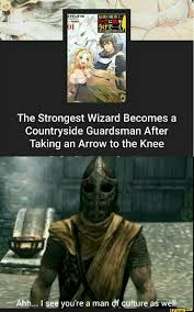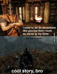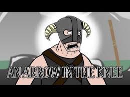 I Took an Arrow in the Knee is a memorable quote based on a stock line often repeated by a non-playable character in the open world role-playing game The Elder Scrolls V. We will not stand for insults from non likers. In the game TES V.