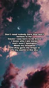Made my mistakes And they gave me wings to fly To my castle in the sky. Born to be brave Now Im standing miles high Like castles in the sky Bosses and queens stand up on your throne Know who you are this is your kingdom Legends at heart individuals Go make your mark be original. Dont need a king.