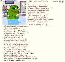 Use Chicken Tendies Poem and thousands of other assets to build an immersive game or experience. Tendies Stories are green text stories featuring a twenty-something man who lives at his mothers home and constantly demands tendies chicken tenders in exchange for good boy points he has earned by doing chores and taking care of himself. I need those tendies.