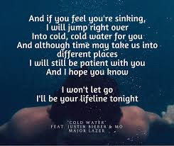 Read or print original Cold Water lyrics 2020 updated. Were feeling low So take a deep breath And let it go You shouldnt be Drowning on your own And if you feel youre sinking I will jump right over Into cold cold Water for you. And if you feel youre sinking I will jump right over into cold cold water for you And although time may take us into different places I will still be patient with you And I hope you know I wont let go Ill be your lifeline tonight I wont let go Ill be your lifeline tonight Cause we all get lost sometimes you know.