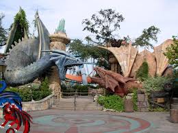 The story of the attraction centered around two dragons Pyrock and Blizzrock one of fire and one of ice who are locked in everlasting combat over control of the lands castle and its loot. Originally located in Merlinwood Dueling Dragons was one of the marquee attractions that Universal marketed leading up to the opening of Islands of Adventure. In the mid-2010s rumors began to swirl in the coaster community that Universal was planning to remove Dueling Dragons to build a new attraction.