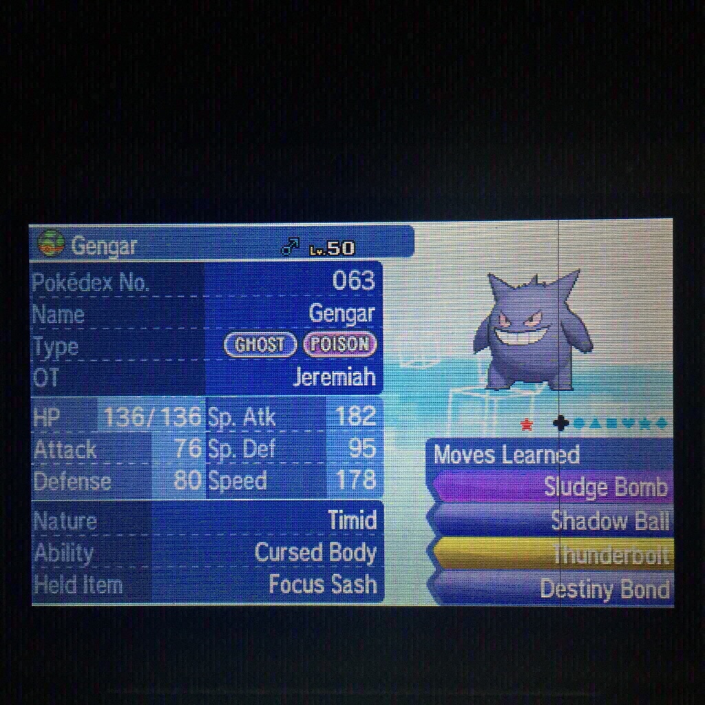 Gengar has a decent movepool with moves that benefit from STAB and cover its main weaknesses. The leer that floats in darkness belongs to a GENGAR delighting in casting curses on people. Cursed Body -- Shadow Tag EVs.