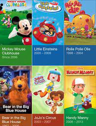 Check out Mickey Mouse Clubhouse Handy Manny Jungle Junction Special Agent Oso and more. Mickey Mouse Clubhouse My Friends Tigger Pooh Handy Manny Jungle Junction Special Agent Oso Olivia WordWorld Gerald McBoing-Boing Animal Mechanicals Timmy. Bear in the Big Blue House October 20 1997 May 6 2007 PBJ Otter March 15 1998 April 8 2005 Rolie Polie Olie October 4 1998 June 2 2006 Out of the Box October 7 1998 June 10 2005 The Book of Pooh January 22 2001 September 4 2005 Stanley September 15 2001 May 16 2008.