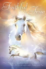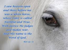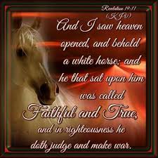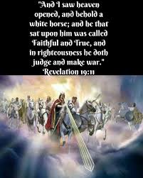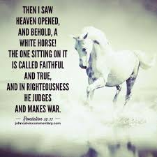 Revelation 19 11. The white horse is the emblem of this and Faithful and True are characters of Christ. The one sitting on it is called Faithful and True and in righteousness he judges and makes war. And I saw heaven opened This is a new and peculiar opening of it in order to show the magnificent expedition of Christ and his attendants against his great adversary.