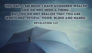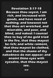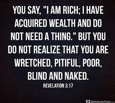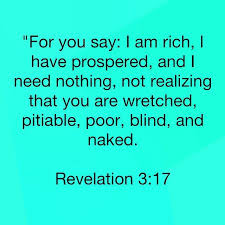 You say I am rich. For you say I am rich I have prospered and I need nothing not realizing that you are wretched pitiable poor blind and naked. 17 Because thou sayest I am rich and increased with goods and have need of nothing.