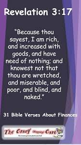 Because thou sayest I am rich and increased with goods and have need of nothing and knowest not that thou art wretched and miserable and poor and blind and naked ASV. And knowest not that thou art wretched and miserable and poor and blind and naked. Revelation 317 17 Because you say n I am rich have become wealthy and have need of nothing and do not know that you are wretched miserable poor blind and naked Read more Share Copy.