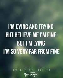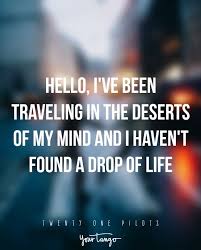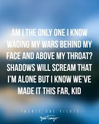 Today we decided to pick out some of the best Twenty One Pilots song quotes whether you need some help to express how youre feeling or just have a good cry over something that has been bothering you for a while. Weve listed a few memorable quotes from this American duo who originate from Columbus Ohio. You dont know my brain the way you know my face I was told when I get older all my fears would shrink but now Im insecure and I care what people think and Are you searching for purpose.