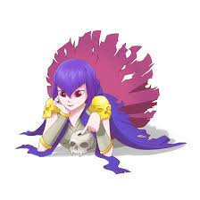 The Witch has short purple hair that goes down to.