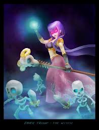 The witch is the final troop unlocked in the dark barracks it is a powerful troop because she deploys skeletons on the battlefieldThe witch doesnt have much health it is almost the same as the wizardBe sure to assist her with a few Giants or other high hit point troops to distract the defenses. But it never fights alone since the Witch can summon an endless horde of Skeletons against your enemy. However she shoots the same projectile as the Witch as opposed to the Clash Royale melee counterpart.