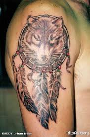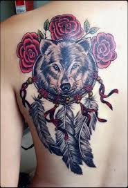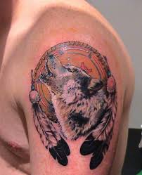 Wolf Dreamcatcher Tattoo On Right Back Shoulder. Wolf Dreamcatcher tattoo design. It is very common to see Dreamcatcher tattoos with spirit animal elements as both as important aspects of Native American culture.